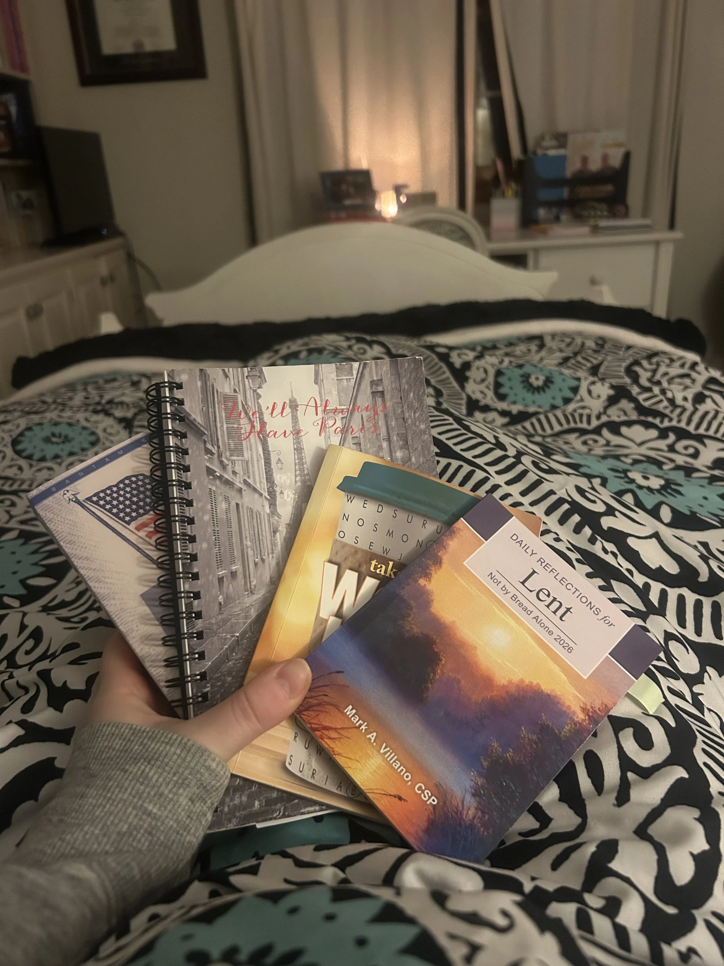 Then I start with my quiet time, which includes a Lenten devotional, journaling, meditation, a word search, and some reading. I always have a candle lit while I enjoy some quiet before the day begins.